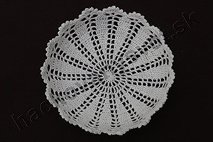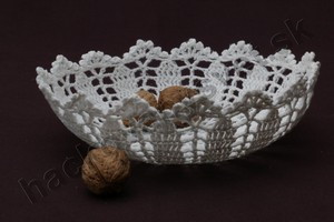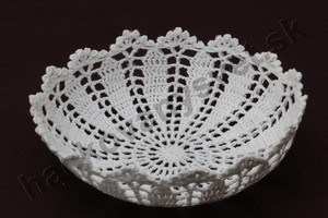 - ručne háčkovaná bavlnená miska/vysokopevná impregnovaná živicou (drží tvar)/umývateľná vodou - rozmer(cm) priemer = 21, výška = 7,5 - materiál: bavlna - farba: biela